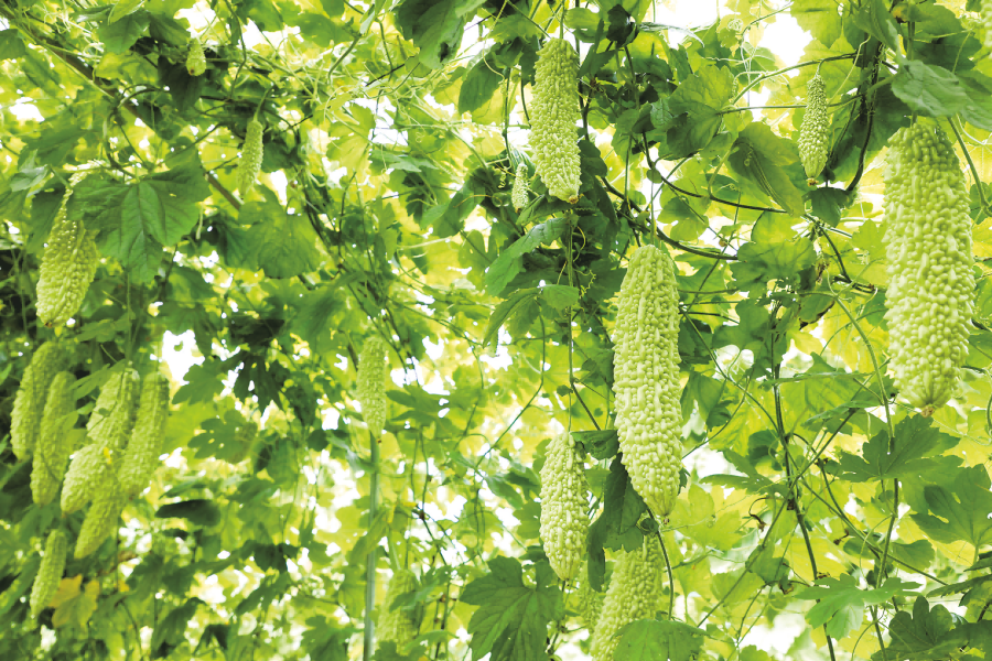 在興寧區(qū)五塘鎮(zhèn),一根根顏色翠綠、個(gè)頭飽滿(mǎn)的“五塘苦瓜”掛滿(mǎn)枝頭。(侯呈志 攝)