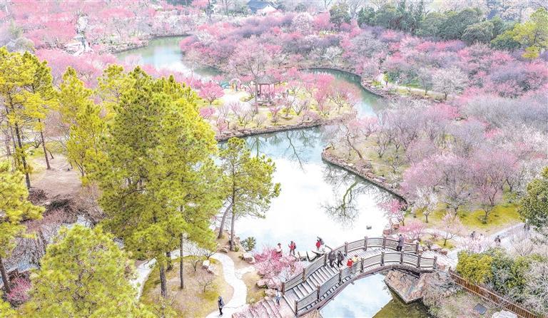 2月25日,游客在江蘇揚(yáng)州瘦西湖風(fēng)景區(qū)賞梅游玩(無人機(jī)照片)。春意漸濃,各地美景吸引人們外出游玩賞景,盡享春日好時(shí)光。 新華社發(fā)