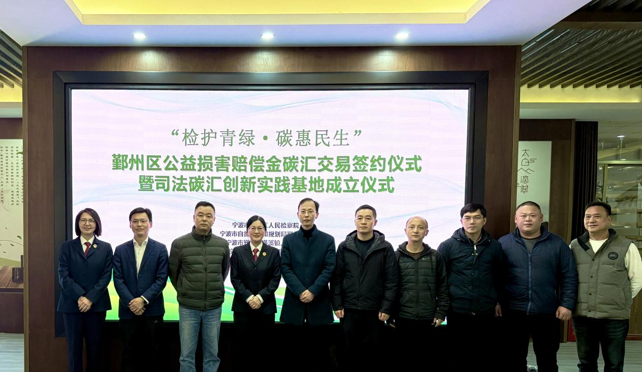 此次活動不僅僅是單一案件的辦結,更是機制化的開端?;顒蝇F(xiàn)場,全市首個“司法碳匯創(chuàng)新實踐基地”正式揭牌。該基地由鄞州區(qū)檢察院牽頭,聯(lián)合寧波市自然資源和規(guī)劃局鄞州分局、橫溪鎮(zhèn)人民政府、寧波產權交易中心共同發(fā)起建設,旨在打造集生態(tài)修復、司法實踐、碳匯交易、法治宣傳于一體的綜合性創(chuàng)新平臺。鄞州區(qū)檢察院聯(lián)合與會單位共同發(fā)布《檢察+碳匯生態(tài)保護倡議書》,以司法之力倡導“檢察+碳匯”生態(tài)保護新模式,將法治力量與綠色行動緊密相連。