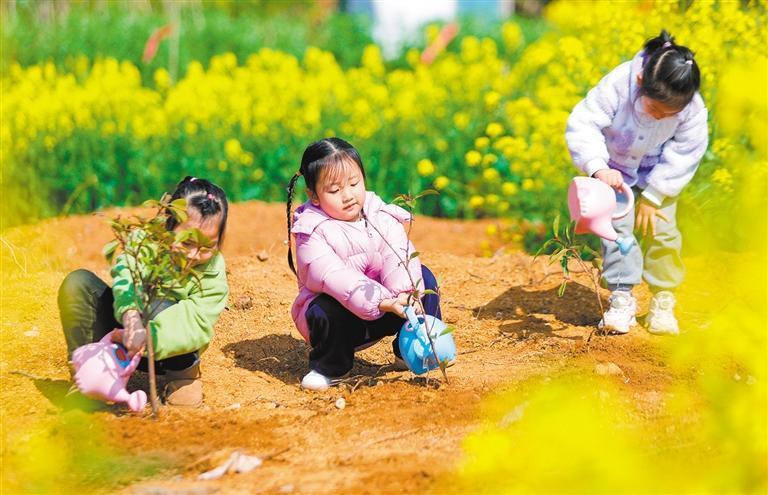 3月11日,江西省吉安市峽江縣城西幼兒園勞動(dòng)基地,小朋友在為新栽種的樹(shù)苗澆水。陳福平攝(中經(jīng)視覺(jué))