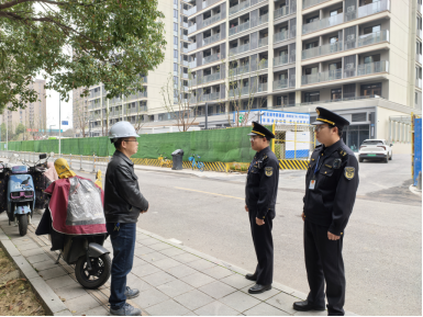 圖為執(zhí)法人員與工地項(xiàng)目經(jīng)理溝通工地外圍非機(jī)動車停放問題