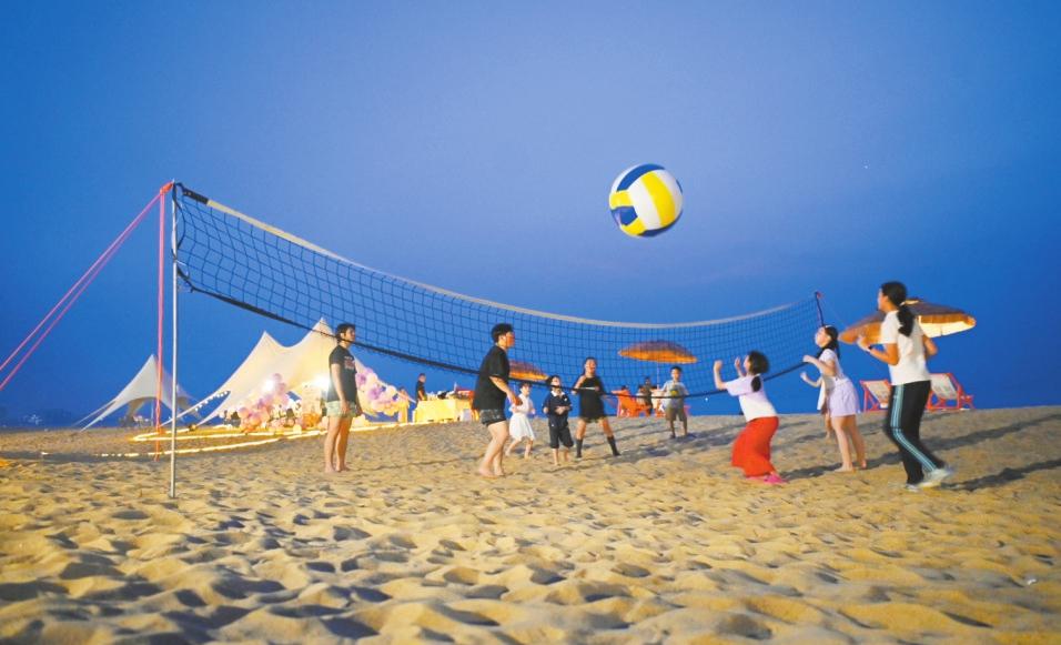 家長(zhǎng)帶著孩子們?cè)诤?跇s山寮村的沙灘上打排球。記者 石中華 攝
