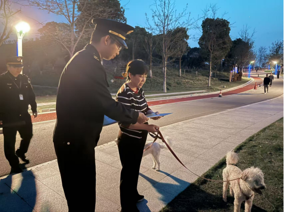 當(dāng)晚,執(zhí)法人員攜帶文明養(yǎng)犬宣傳單頁,在橋西岸路、中山路、橋東岸路等城區(qū)重點(diǎn)路段開展集中宣傳與整治。在鳳山體育公園門口,不少市民帶著寵物散步消食。執(zhí)法人員巡查時(shí)發(fā)現(xiàn),一名中年男子牽著一只犬只,另有兩只犬只未牽繩隨行,在人群中自由穿梭。“白天在家關(guān)了一天,晚上出來遛個(gè)彎,小狗這么乖,肯定不會(huì)咬人?!泵鎸?duì)執(zhí)法人員,男子滿不在乎地解釋。