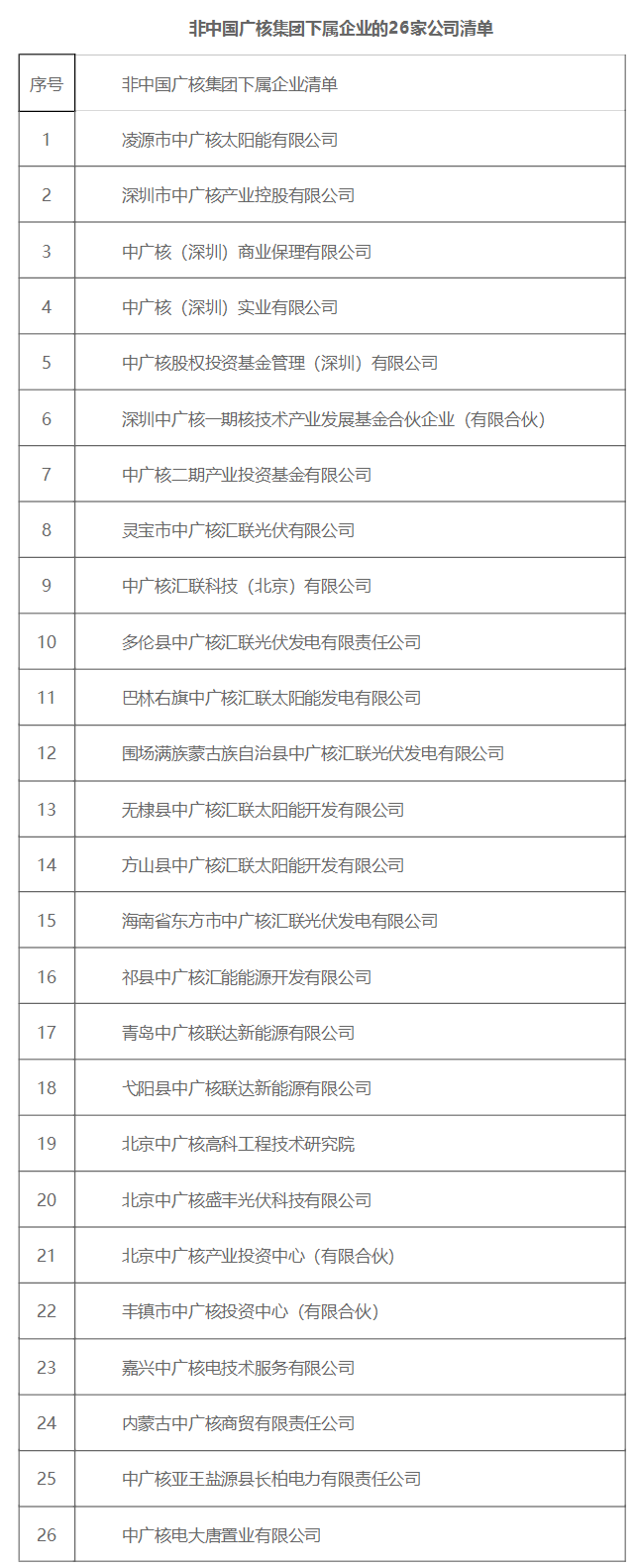 4月份,中廣核發(fā)布公告稱:凌源市中廣核太陽能有限公司、深圳市中廣核產(chǎn)業(yè)控股有限公司、嘉興中廣核電技術(shù)服務(wù)有限公司等26家公司在企業(yè)名稱中使用“中廣核”字樣。鑒于該26家公司并非我集團下屬企業(yè),鄭重澄清并嚴正聲明,中國廣核集團未擁有下述26家公司的任何資產(chǎn)或股權(quán),亦無隸屬或管理關(guān)系,并未授權(quán)下述公司使用“中廣核”商標和字號,若因下述公司的經(jīng)營行為導(dǎo)致法律、勞務(wù)糾紛或其他相關(guān)責任,均與我集團無關(guān)。