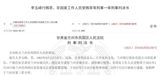 2021年3月,李玉峰因“個(gè)人原因”從蘭州銀行辭職。從判決書透露的時(shí)間線來(lái)看,2021年1月18日,李玉峰已被蘭州市西固區(qū)監(jiān)察委員會(huì)采取留置措施,并于2021年7月16日被刑事拘留,同年7月22日被執(zhí)行逮捕。