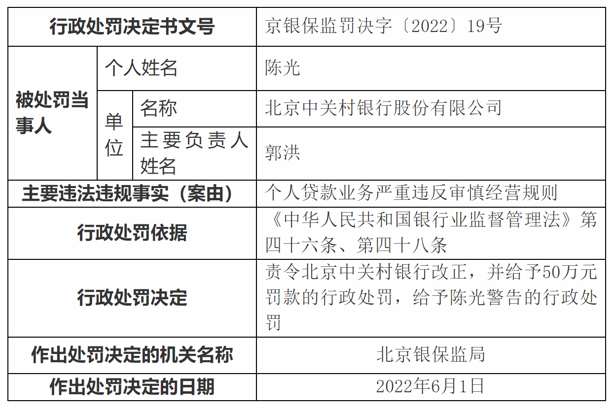 據(jù)銀保監(jiān)會網(wǎng)站消息,近日北京銀保監(jiān)局對北京中關(guān)村銀行開出罰單,針對個(gè)人貸款業(yè)務(wù)嚴(yán)重違反審慎經(jīng)營規(guī)則的違法違規(guī)行為,責(zé)令該行改正,罰款50萬元,并對責(zé)任人陳光進(jìn)行警告。