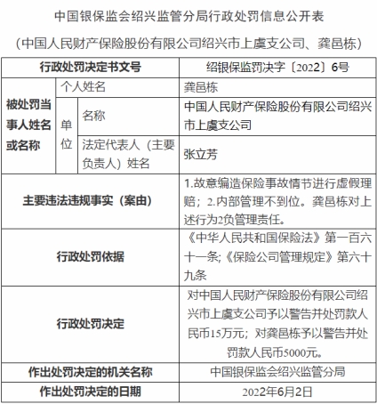 根據(jù)《中華人民共和國保險法》第一百六十一條、《保險公司管理規(guī)定》第六十九條,中國銀保監(jiān)會紹興監(jiān)管分局對中國人民財產(chǎn)保險股份有限公司紹興市上虞支公司予以警告并處罰款人民幣15萬元,對龔邑棟予以警告并處罰款人民幣5000元。