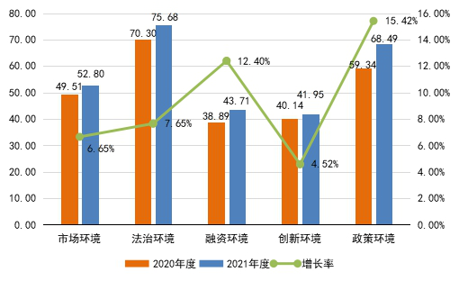從五個(gè)一級(jí)指標(biāo)來(lái)看,各參評(píng)城市市場(chǎng)環(huán)境、法治環(huán)境、融資環(huán)境、創(chuàng)新環(huán)境和政策環(huán)境整體均有所改善,得分均值分別為52.80、75.68、43.71、41.95和68.49,分別比上次評(píng)估增長(zhǎng)6.65%、7.65%、12.40%、4.52%和15.42%。
