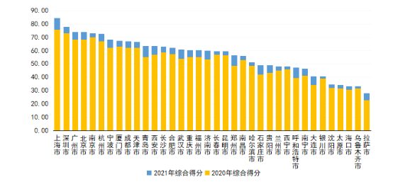 評(píng)估顯示,2021年度各參評(píng)城市綜合得分均值為56.53,比上次評(píng)估得分均值(51.63)增長(zhǎng)9.49%。所有參評(píng)城市綜合得分較上次均有所提升,超過(guò)5%的城市有33個(gè),占比達(dá)91.67%;超過(guò)10%的城市有12個(gè),占比達(dá)33.33%。