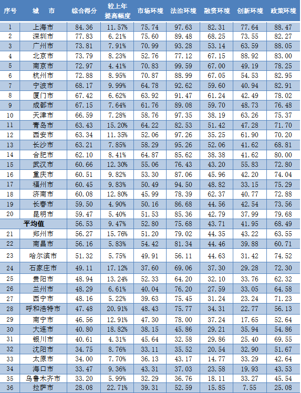評(píng)估顯示,各參評(píng)城市政策環(huán)境和融資環(huán)境改善比較明顯,政策環(huán)境平均得分從59.34提升至68.49,其中,有24個(gè)城市上升超過(guò)10%;融資環(huán)境平均得分從38.89提升至43.71,其中,有22個(gè)城市上升超過(guò)10%。