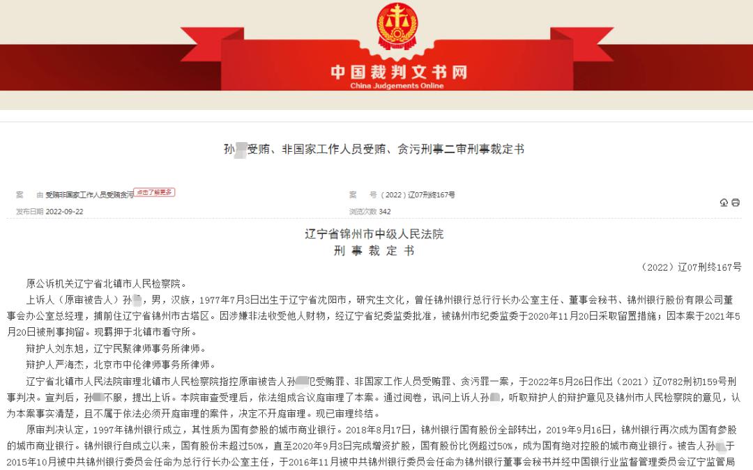 日前,中國裁判文書網(wǎng)發(fā)布一份刑事裁定書,披露了錦州銀行(00416.HK)原董事會秘書孫某受賄、非國家工作人員受賄、貪污一案的具體情況。