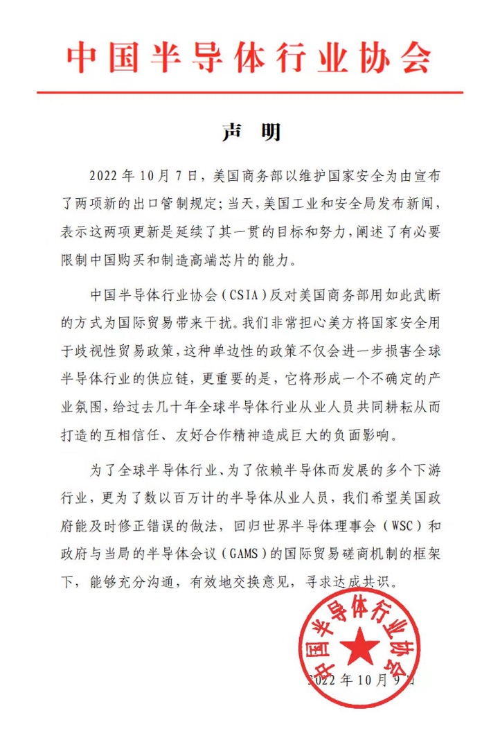 在聲明中,中國(guó)半導(dǎo)體行業(yè)協(xié)會(huì)指出,10月7日,美國(guó)工業(yè)和安全局發(fā)布新聞,表示這兩項(xiàng)出口管制規(guī)定更新是延續(xù)了其一貫的目標(biāo)和努力,闡述了有必要限制中國(guó)購(gòu)買(mǎi)和制造高端芯片的能力。