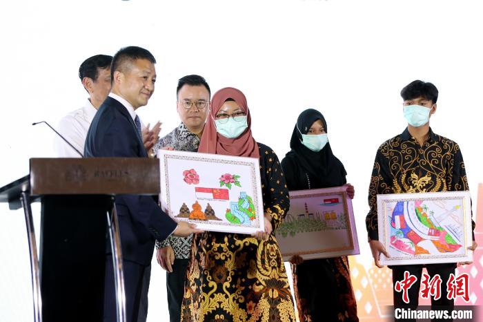 圖為受過(guò)中企捐贈(zèng)的印尼民眾向陸慷大使贈(zèng)送畫作表達(dá)對(duì)兩國(guó)關(guān)系的祝福
