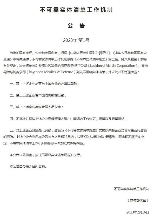 據(jù)商務部官網(wǎng)消息,2月16日,不可靠實體清單工作機制發(fā)布2023年第1號公告,決定將洛克希德·馬丁公司、雷神導彈與防務公司列入不可靠實體清單。