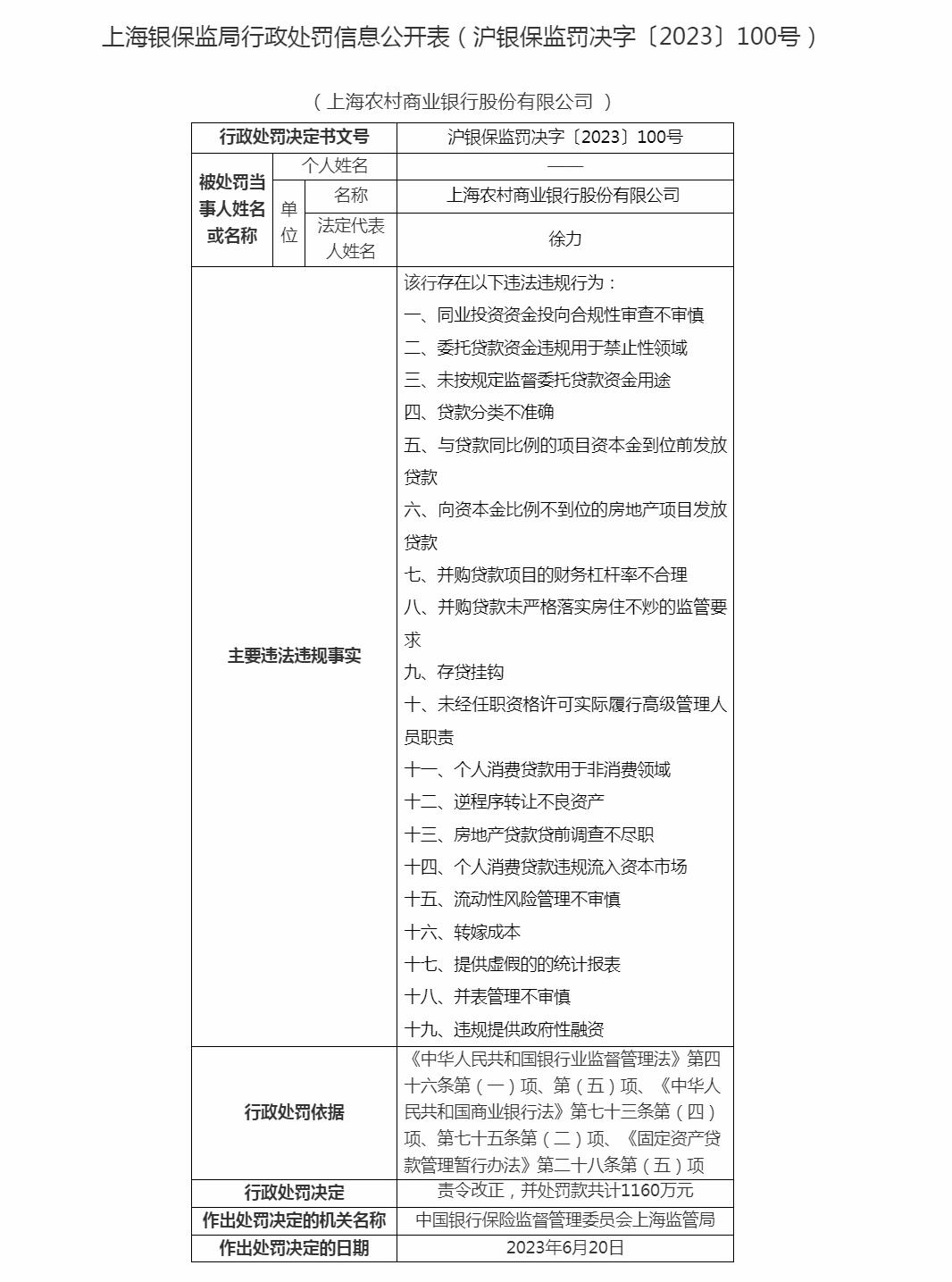 對(duì)此,上海銀保監(jiān)局依據(jù)《中華人民共和國(guó)銀行業(yè)監(jiān)督管理法》第四十六條第(一)項(xiàng)、第(五)項(xiàng)、《中華人民共和國(guó)商業(yè)銀行法》第七十三條第(四)項(xiàng)、第七十五條第(二)項(xiàng)、《固定資產(chǎn)貸款管理暫行辦法》第二十八條第(五)項(xiàng)的規(guī)定,對(duì)上海農(nóng)商銀行作出責(zé)令改正,并處罰款共計(jì)1160萬(wàn)元。作出行政處罰決定日期為2023年6月20日。