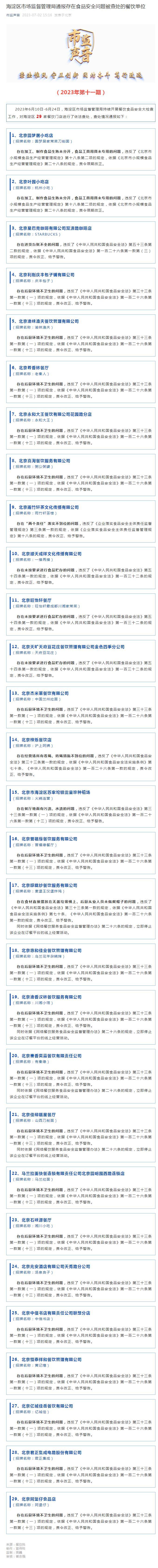 7月2日,北京市海淀區(qū)市場監(jiān)督管理局在其公眾號通報存在食品安全問題被查處的餐飲單位。6月10日-6月24日,海淀區(qū)市場監(jiān)督管理局持續(xù)開展餐飲食品安全大檢查工作,對海淀區(qū)29家餐飲門店進(jìn)行了依法查處。