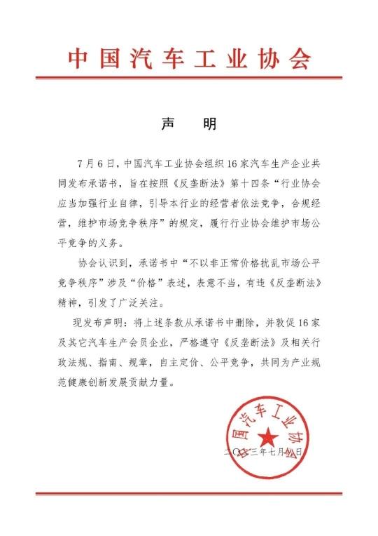 中國汽車工業(yè)協(xié)會表示,現(xiàn)發(fā)布聲明:將上述條款從承諾書中刪除,并敦促16家及其它汽車生產(chǎn)會員企業(yè),嚴(yán)格遵守《反壟斷法》及相關(guān)行政法規(guī)、指南、規(guī)章,自主定價、公平競爭,共同為產(chǎn)業(yè)規(guī)范健康創(chuàng)新發(fā)展貢獻(xiàn)力量。