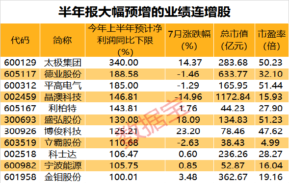 行情上來(lái)看,業(yè)績(jī)預(yù)計(jì)連增股本月以下跌為主,平均下跌1.23%,萬(wàn)澤股份、晶澳科技、康緣藥業(yè)、太極集團(tuán)7月以來(lái)跌幅均超過(guò)14%。