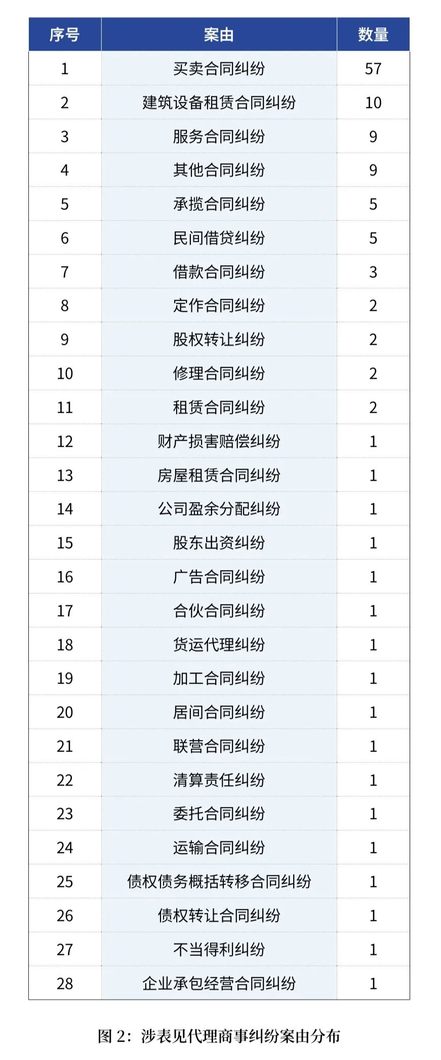 2019年至2022年審結(jié)的涉表見代理商事糾紛案件共涉及28個案由,其中買賣合同糾紛案件為57件,占比46.34%,接近總數(shù)量的一半;建筑設備租賃合同糾紛案件為10件,占比8.13%;服務合同糾紛案件、其他合同糾紛案件各為9件,分別占比7.32%,此四類合同,分別占結(jié)案數(shù)的前三位。(如圖2)
