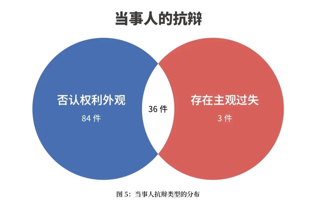 123件涉表見代理商事合同糾紛案件中,有84件抗辯否認權利外觀存在,有3件抗辯相對人主觀上存在過失,有36件抗辯既否認權利外觀存在,又認為相對人主觀上存在過失。(如圖5)