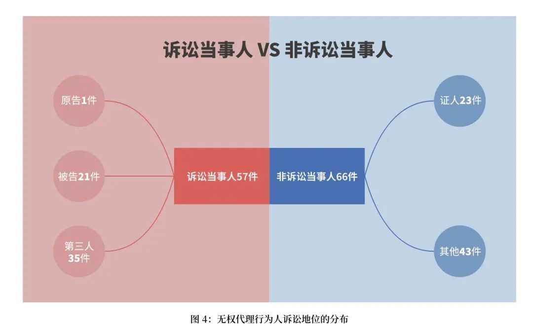 123件涉表見代理商事糾紛案件中,有57件將行為人列為訴訟當事人,有66件未將行為人列為訴訟當事人。在57件將行為人列為當事人的案件中,行為人訴訟地位為原告的有1件,訴訟地位為被告的有21件,訴訟地位為第三人的有35件。在66件未將行為人列為當事人的案件中,行為人作為證人出庭作證的有23件。(如圖4)