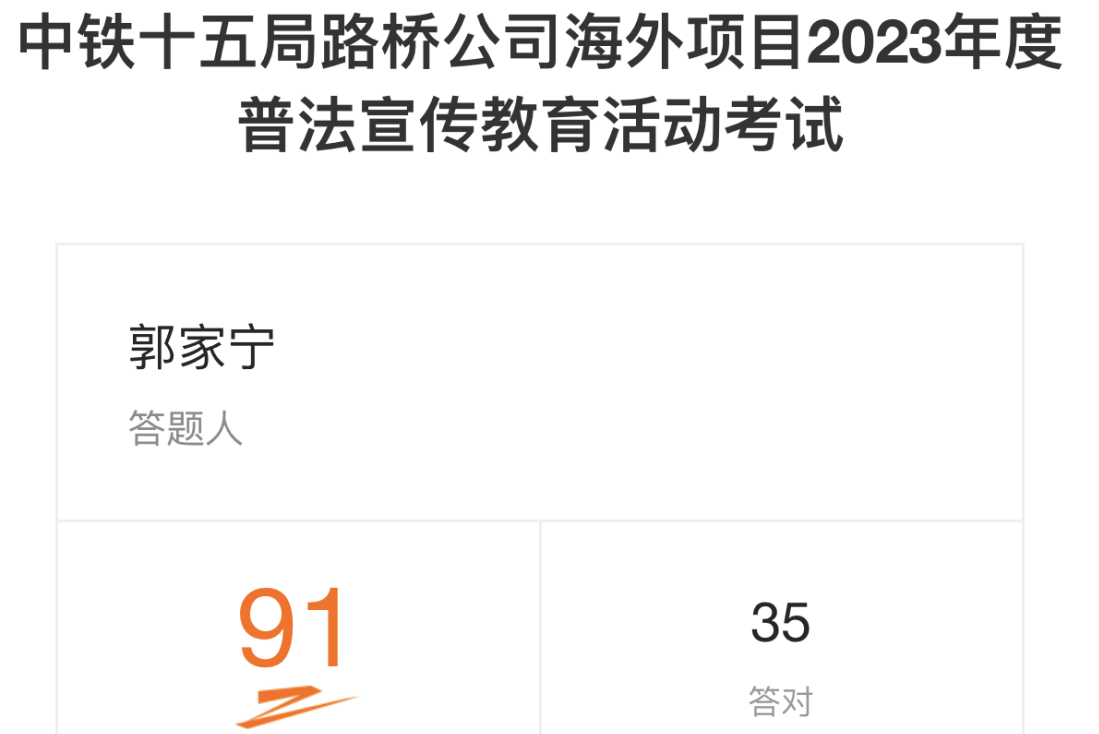 活動期間,公司境外項目開展線上法律知識測試活動,試卷內容涉及憲法、民法 、安全生產法等法律法規(guī)知識,深入貼合職工生活和工作實際,針對性強。通過以考促學、以考促用,為建設法治路橋、平安路橋提供堅強有力保障。