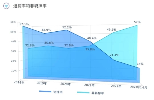 拘留和逮捕等羈押性強制措施是為了保障刑事訴訟順利進行,適用于嚴重犯罪或者有社會危險性,有再犯、串供等風險的案件。輕罪案件因行為本身情節(jié)較輕,社會危害性相對較小,一些抽象危險犯,如危險駕駛罪等,甚至沒有造成實害后果。另外,隨著偵查水平和科技程度的與日俱增,刑事案件的定案對口供的依賴程度明顯降低,尤其法定犯的犯罪性質(zhì)決定了證據(jù)上以客觀證據(jù)為主,辦案過程中對羈押的需求減弱。因此,針對輕罪案件采取羈押措施更為審慎,逮捕強制措施的適用比例不斷降低,取保候?qū)彽确橇b押強制措施的適用比例大幅上升。2018年海淀區(qū)檢察院受理的輕罪案件中,采取逮捕強制措施的為57.1%,采取取保候?qū)?、監(jiān)視居住等非羈押強制措施的為32.6%;2019年,二者占比分別為48.9%、35.8%;2022年,二者比例則為21.4%、49.7%;2023年1-8月,采取逮捕強制措施的比例下降至14%,非羈押強制措施的適用率則上升至57%。