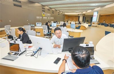 在??诮瓥|新區(qū)政務(wù)服務(wù)中心辦事大廳,工作人員為市民提供咨詢服務(wù)。李天平 攝