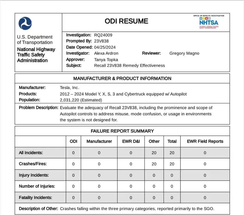 此次調(diào)查涵蓋美國(guó)2012年至2024年生產(chǎn)的配備輔助駕駛系統(tǒng)Autopilot的Model Y、X、S、3和Cyber truck車輛。