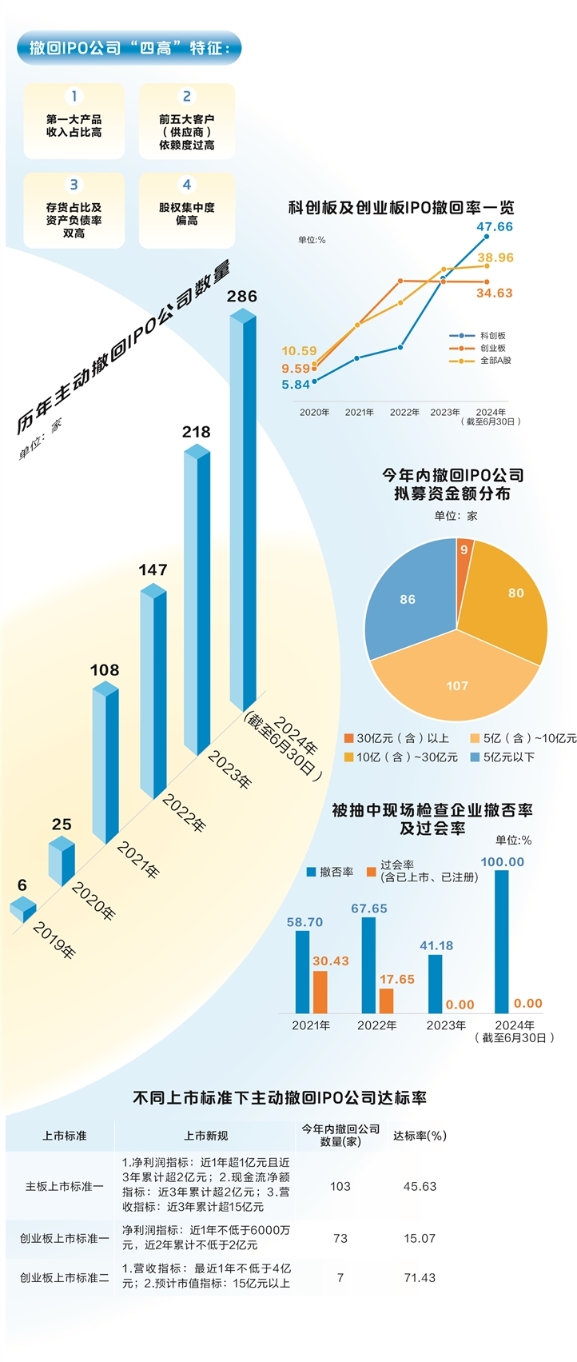 嚴監(jiān)管威力逐漸顯現(xiàn),企業(yè)在IPO申報時更加審慎考慮是否“夠格”。據(jù)證券時報·數(shù)據(jù)寶統(tǒng)計,按公告日計算,截至6月30日(下文統(tǒng)計的時間截點均為該日),今年內(nèi)共有286家主動撤回IPO申請的公司(以下簡稱“撤回IPO公司”),數(shù)量已超過去年全年的218家,創(chuàng)下歷史新高。