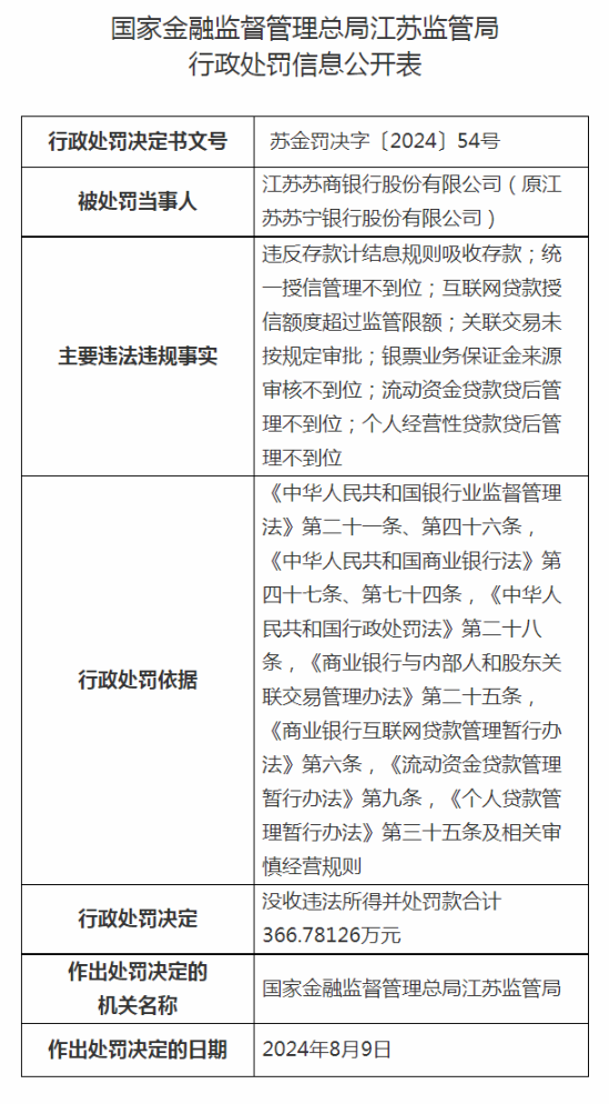 針對上述違法違規(guī)行為,國家金融監(jiān)督管理總局江蘇監(jiān)管局依據(jù)《中華人民共和國銀行業(yè)監(jiān)督管理法》第二十一條、第四十六條,《中華人民共和國商業(yè)銀行法》第四十七條、第七十四條,《中華人民共和國行政處罰法》第二十八條,《商業(yè)銀行與內(nèi)部人和股東關(guān)聯(lián)交易管理辦法》第二十五條,《商業(yè)銀行互聯(lián)網(wǎng)貸款管理暫行辦法》第六條,《流動資金貸款管理暫行辦法》第九條,《個人貸款管理暫行辦法》第三十五條及相關(guān)審慎經(jīng)營規(guī)則,對蘇商銀行沒收違法所得并處罰款合計366.78126萬元。作出行政處罰決定日期為2024年8月9日。