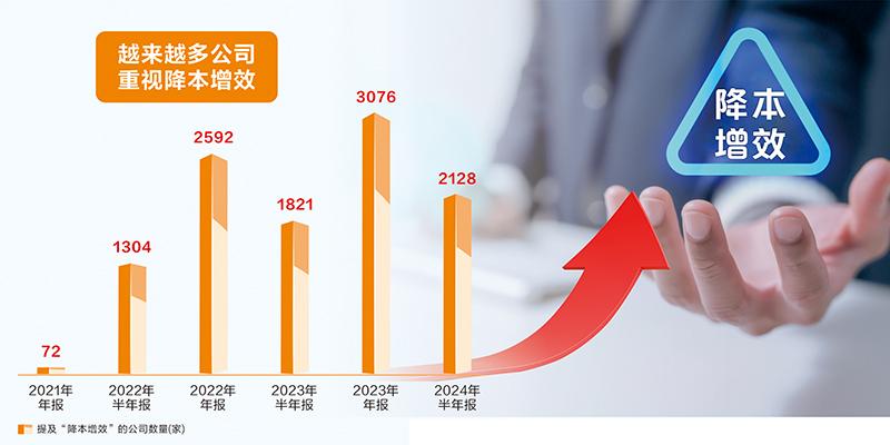 據(jù)證券時報·數(shù)據(jù)寶統(tǒng)計,在半年報或年報中提及“降本增效”這一關(guān)鍵詞的上市公司數(shù)量呈逐年上升趨勢。2022年年報提及的公司接近2600家,此前一年不足百家;2023年年報提及的公司數(shù)量再創(chuàng)新高,超過3000家。2024年半年報中,超過2100家公司再度提及降本增效,數(shù)量依然創(chuàng)下歷史同期最高。