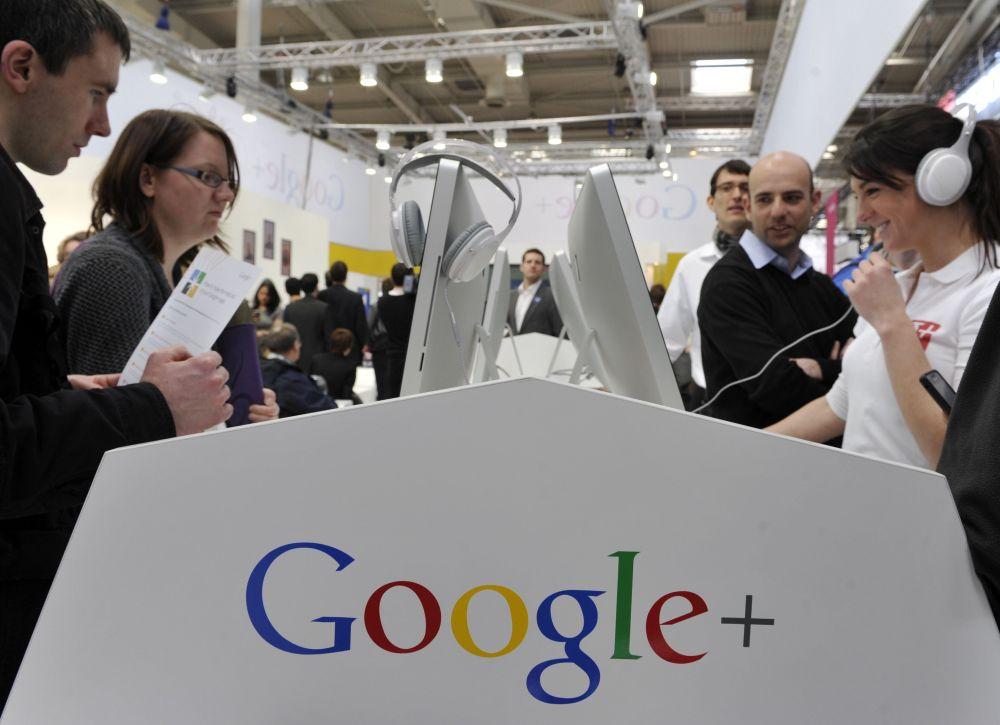 這張資料照片顯示,2012年3月6日,在德國(guó)漢諾威會(huì)展中心舉行的漢諾威信息及通信技術(shù)博覽會(huì)上,參觀者在谷歌展臺(tái)參觀。新華社記者馬寧攝