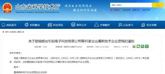 《通知》內容顯示,根據(jù)《高新技術企業(yè)認定管理辦法》(國科發(fā)火〔2016〕32號)和《高新技術企業(yè)認定管理工作指引》(國科發(fā)火〔2016〕195號)有關規(guī)定,經研究,決定撤銷煙臺引航電子科技有限公司等85家企業(yè)的高新技術企業(yè)資格。山東萊鋼永鋒鋼鐵有限公司則列于名單第78位,證書編號GR202237007406,撤銷起始年份為2023年。