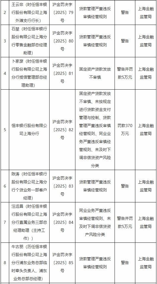 具體看,時任恒豐銀行上海分行授信管理部總經(jīng)理助理卜家彥被警告并罰款5萬元,涉及的主要違法違規(guī)行為是固定資產(chǎn)貸款發(fā)放不審慎;時任恒豐銀行上海分行直屬業(yè)務(wù)三部總經(jīng)理助理(主持工作)汪運昌被警告并罰款5萬元,涉及的主要違法違規(guī)行為是同業(yè)業(yè)務(wù)嚴重違反審慎經(jīng)營規(guī)則、未及時下調(diào)非信貸資產(chǎn)風險分類;時任恒豐銀行上海外灘支行行長王云非,時任恒豐銀行上海分行零售金融部總經(jīng)理助理石堃,時任恒豐銀行上海分行個貸業(yè)務(wù)一部客戶經(jīng)理陳濤,以及牛古朋被警告,牛古朋歷任恒豐銀行上海分行浦東業(yè)務(wù)總部臨時牽頭負責人、浦東業(yè)務(wù)總部總經(jīng)理,他們涉及的主要違法違規(guī)行為是貸款管理嚴重違反審慎經(jīng)營規(guī)則。