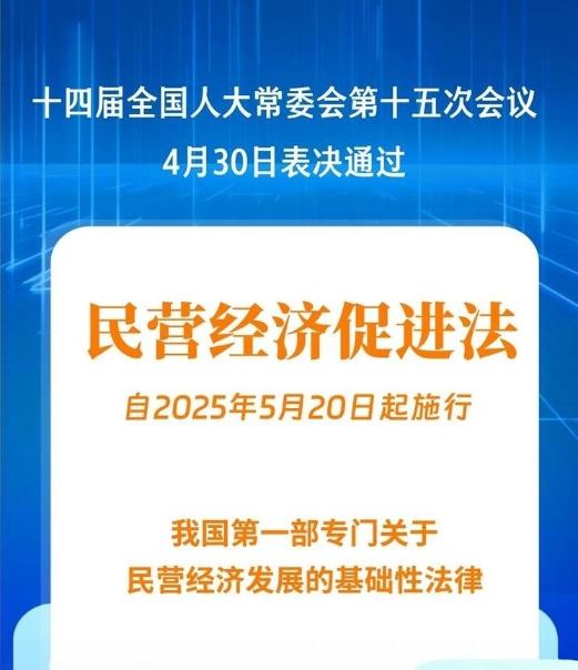 4月30日,十四屆全國人大常委會第十五次會議表決通過民營經(jīng)濟促進法,自2025年5月20日起施行。民營經(jīng)濟促進法共9章78條,包括總則、公平競爭、投資融資促進、科技創(chuàng)新、規(guī)范經(jīng)營、服務(wù)保障、權(quán)益保護、法律責(zé)任和附則。