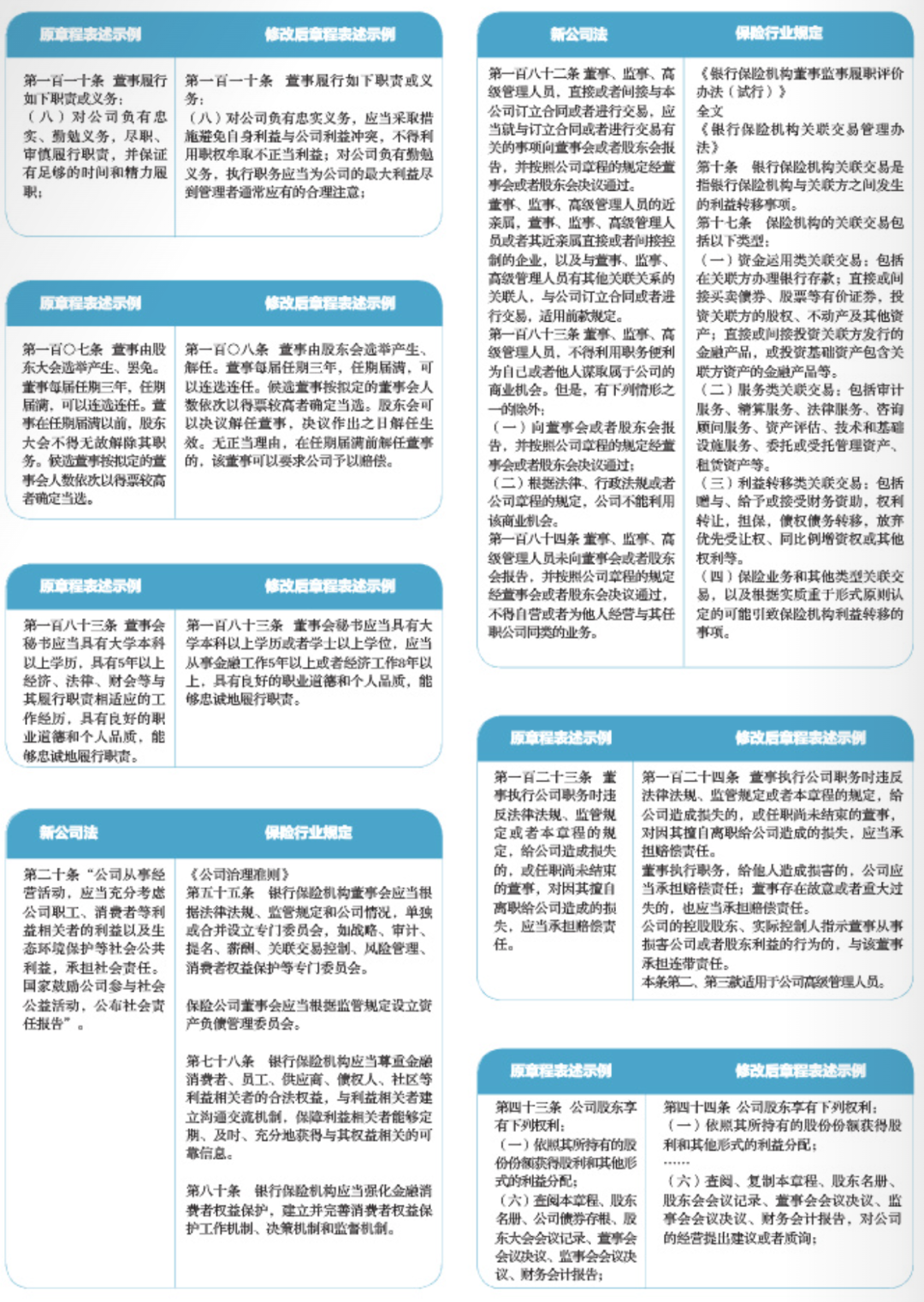 新公司法第一百八十二條至第一百八十四條對(duì)董事、監(jiān)事、高級(jí)管理人員忠實(shí)義務(wù)作出細(xì)致規(guī)定,分別涉及自我交易、謀取公司商業(yè)機(jī)會(huì)、競(jìng)業(yè)等方面?!躲y行保險(xiǎn)機(jī)構(gòu)關(guān)聯(lián)交易管理辦法》對(duì)保險(xiǎn)機(jī)構(gòu)關(guān)聯(lián)交易的類(lèi)型進(jìn)行了具體羅列,還對(duì)關(guān)聯(lián)交易的交易金額、重大程度作出規(guī)定,并明確保險(xiǎn)公司的董事會(huì)應(yīng)當(dāng)設(shè)立關(guān)聯(lián)交易控制委員會(huì),董事會(huì)對(duì)關(guān)聯(lián)交易管理承擔(dān)最終責(zé)任,這些都為保險(xiǎn)公司關(guān)聯(lián)交易管理的具體執(zhí)行提供了依據(jù)。筆者認(rèn)為,保險(xiǎn)機(jī)構(gòu)在修訂章程時(shí),應(yīng)按照前述更為嚴(yán)格的規(guī)定完善諸如關(guān)聯(lián)交易等內(nèi)容。