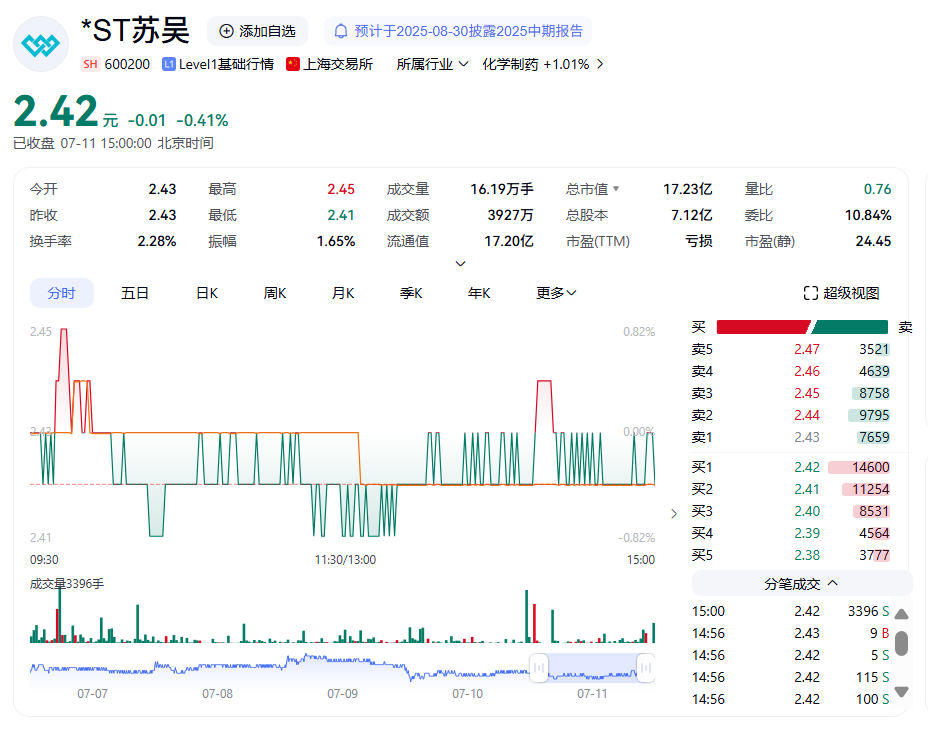截至7月11日,*ST蘇吳股價報2.42元/股,總市值17.23億元。截至2025年3月31日,公司股東達到8.6萬戶。