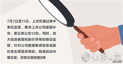 監(jiān)管部門加大事中事后監(jiān)管。比如,僅7月7日至11日期間,上交所就要求上市公司披露補(bǔ)充、更正類公告12份。同時,加大信息披露和股價異常的聯(lián)動監(jiān)管,針對公司披露敏感信息或股價發(fā)生明顯異常的,提請啟動內(nèi)幕交易、異常交易核查8單。