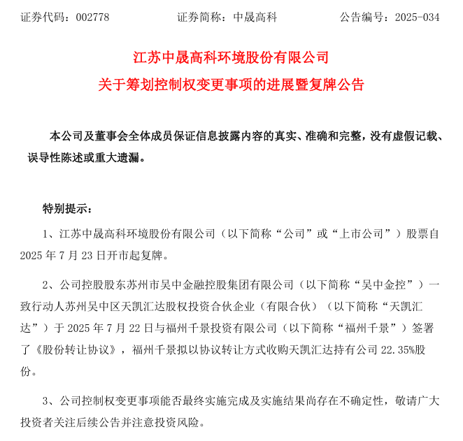 7月22日晚,中晟高科發(fā)布《關(guān)于籌劃控制權(quán)變更事項(xiàng)的進(jìn)展暨復(fù)牌公告》稱,公司控股股東蘇州市吳中金融控股集團(tuán)有限公司(以下簡稱“吳中金控”)一致行動人蘇州吳中區(qū)天凱匯達(dá)股權(quán)投資合伙企業(yè)(有限合伙)(以下簡稱“天凱匯達(dá)”)于7月22日與福州千景投資有限公司(以下簡稱“福州千景”)簽署了《股份轉(zhuǎn)讓協(xié)議》,福州千景擬以協(xié)議轉(zhuǎn)讓方式收購天凱匯達(dá)持有公司22.35%股份。公司股票自7月23日開市起復(fù)牌。