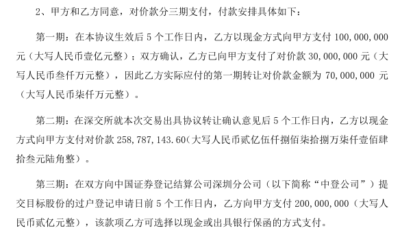 對價款分三期支付。第一期在本協(xié)議生效后5個工作日內(nèi),福州千景以現(xiàn)金方式向天凱匯達(dá)支付1億元;雙方確認(rèn),福州千景已向天凱匯達(dá)支付了對價款3000萬元,因此福州千景實(shí)際應(yīng)付的第一期轉(zhuǎn)讓對價款金額為7000萬元。第二期在深交所就本次交易出具協(xié)議轉(zhuǎn)讓確認(rèn)意見后5個工作日內(nèi),福州千景以現(xiàn)金方式向天凱匯達(dá)支付對價款2.59億元。第三期在雙方向中國證券登記結(jié)算公司深圳分公司提交目標(biāo)股份的過戶登記申請日前5個工作日內(nèi),福州千景向天凱匯達(dá)支付2億元,可選擇以現(xiàn)金或出具銀行保函的方式支付。