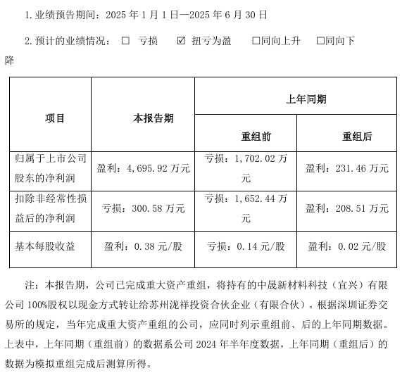 公司稱,公司實(shí)施完成重大資產(chǎn)重組,將持有的中晟新材料科技(宜興)有限公司100%股權(quán)以現(xiàn)金方式轉(zhuǎn)讓給蘇州瀧祥投資合伙企業(yè)(有限合伙),產(chǎn)生投資收益4846.38萬元。公司環(huán)保板塊上半年工程結(jié)算收入較少,導(dǎo)致扣除非經(jīng)常性損益后歸屬于上市公司股東的凈利潤為負(fù)數(shù)。