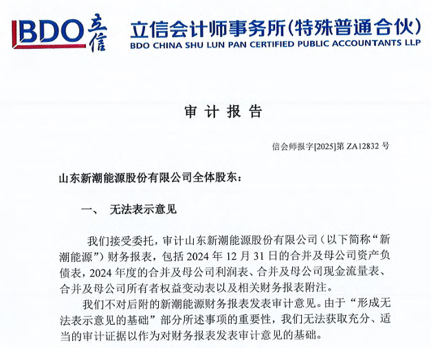 值得關(guān)注的是,因未能按時(shí)披露定期報(bào)告,*ST新潮股票自5月6日起停牌,并引發(fā)證監(jiān)會(huì)立案調(diào)查。在經(jīng)歷數(shù)月的加急審計(jì)后,立信會(huì)計(jì)師事務(wù)所7月5日完成了ST新潮2024年年報(bào)及2025年一季報(bào)的審計(jì)。然而,立信對(duì)財(cái)務(wù)報(bào)告和內(nèi)部控制均出具了“無(wú)法表示意見(jiàn)”的審計(jì)結(jié)論。