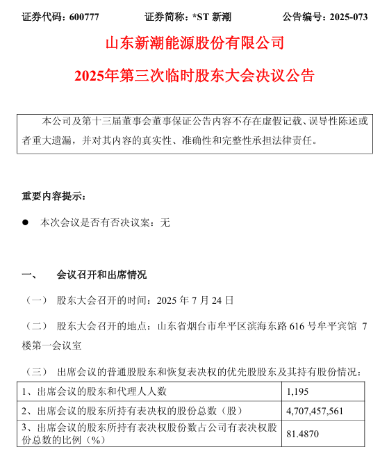 7月24日下午,*ST新潮臨時(shí)股東大會(huì)在山東煙臺(tái)牟平賓館召開(kāi)。此次股東大會(huì)是在新晉第一大股東伊泰B股向現(xiàn)任董監(jiān)事會(huì)提出“提前換屆”訴求屢次遭拒后,由6位中小股東自行召集舉行的。這也是2025年A股上市公司中首例由中小股東自行召集的股東大會(huì)。