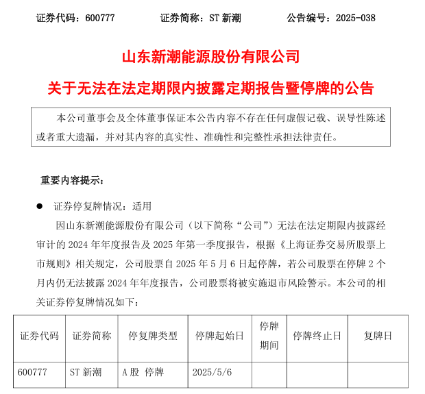 4月30日,公司披露關(guān)于無(wú)法在法定期限內(nèi)披露定期報(bào)告暨停牌的公告。按照相關(guān)規(guī)定,公司在股票停牌后兩個(gè)月內(nèi)仍未披露2024年年度報(bào)告的,將被實(shí)施退市風(fēng)險(xiǎn)警示;如公司股票交易被實(shí)施退市風(fēng)險(xiǎn)警示之日起兩個(gè)月內(nèi)仍未披露過(guò)半數(shù)董事保證真實(shí)性、準(zhǔn)確性和完整性的2024年年度報(bào)告,公司股票將被終止上市。