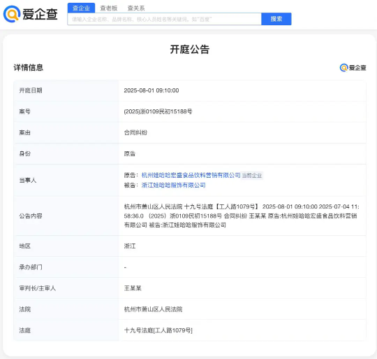 愛企查App顯示,近日,杭州娃哈哈宏盛食品飲料營(yíng)銷有限公司與浙江娃哈哈服飾有限公司相關(guān)合同糾紛案件新增開庭公告,原告為杭州娃哈哈宏盛食品飲料營(yíng)銷有限公司,該案件將于8月1日在杭州市蕭山區(qū)人民法院開庭審理。