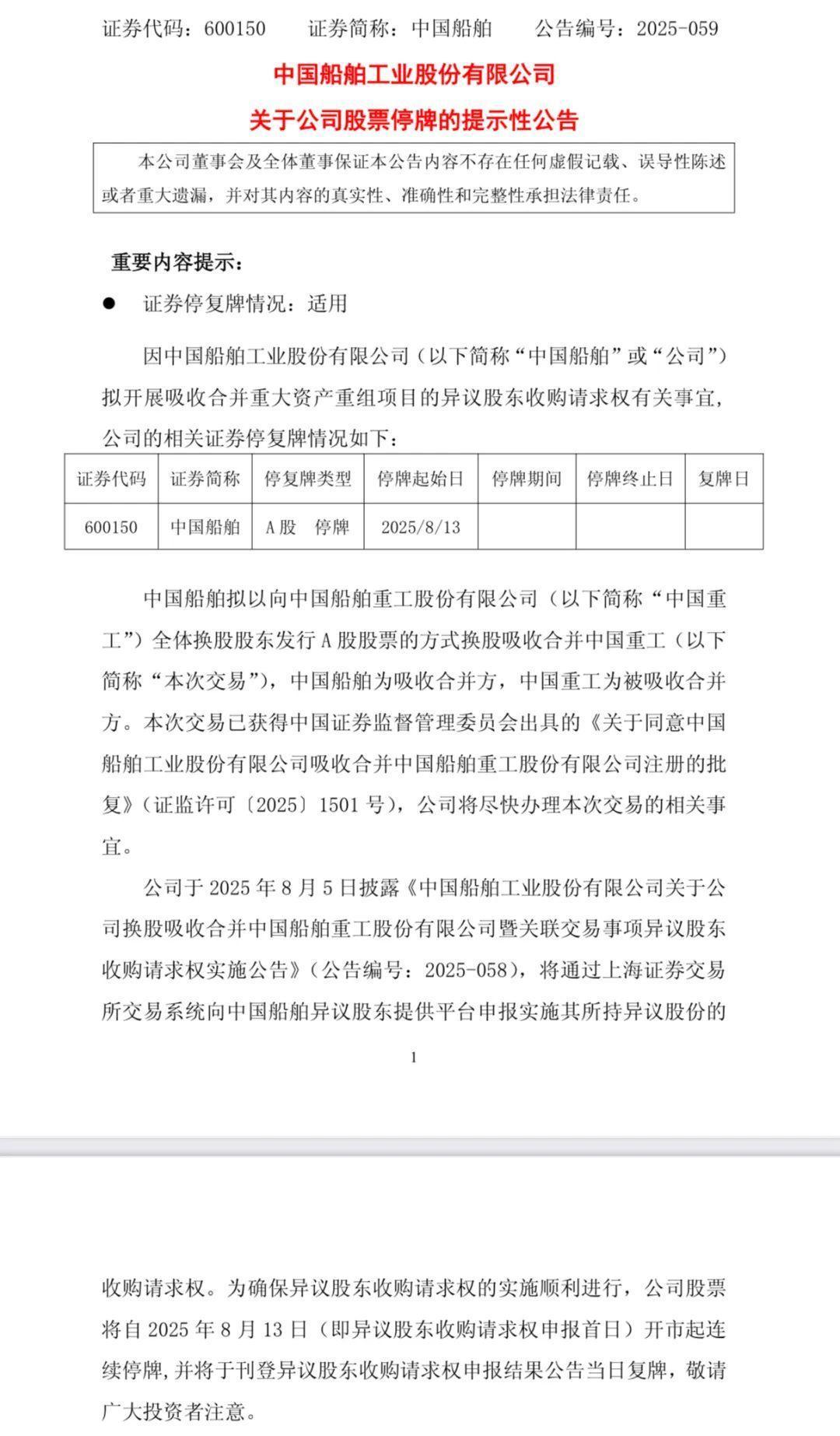 8月4日晚間,中國(guó)船舶發(fā)布公告稱,公司擬開展吸收合并重大資產(chǎn)重組項(xiàng)目的異議股東收購(gòu)請(qǐng)求權(quán)有關(guān)事宜,公司股票將自2025年8月13日開市起連續(xù)停牌,并將于刊登異議股東收購(gòu)請(qǐng)求權(quán)申報(bào)結(jié)果公告當(dāng)日復(fù)牌。