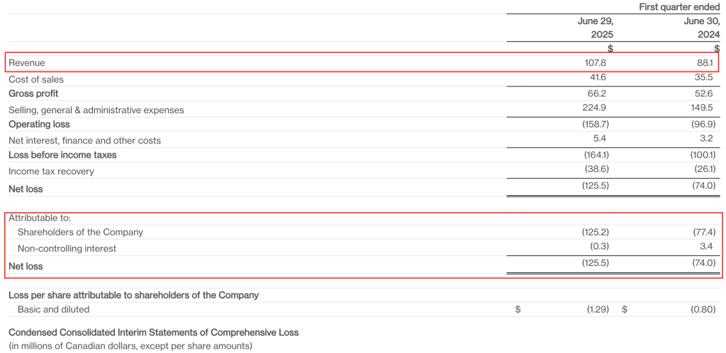 加拿大鵝是全球高性能奢華生活方式品牌,一家定位高端的羽絨服制造公司,創(chuàng)立于1957年。據(jù)加拿大鵝7月31日發(fā)布的截至2025年6月29日的2026財(cái)年第一財(cái)季財(cái)務(wù)業(yè)績(jī)顯示,第一財(cái)季實(shí)現(xiàn)營(yíng)收1.078億美元,同比增長(zhǎng)22.4%,按固定匯率計(jì)算增長(zhǎng)21.5%;歸母凈虧損為-1.252億美元,去年同期為-0.774億美元,虧損同比擴(kuò)大超六成。
