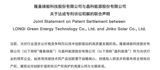 聲明以中英雙語呈現(xiàn),稱隆基綠能與晶科能源聯(lián)合宣布,就雙方及雙方關(guān)聯(lián)公司在全球范圍內(nèi)正在進行的相關(guān)專利主張和法律事項,達成和解協(xié)議。