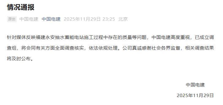 央視網(wǎng)消息:據(jù)中國電建微信公眾號(hào)消息,中國電建11月29日晚發(fā)布情況通報(bào),針對(duì)媒體反映福建永安抽水蓄能電站施工過程中存在的質(zhì)量等問題,中國電建高度重視,已成立調(diào)查組,將會(huì)同有關(guān)方面全面調(diào)查核實(shí),依法依規(guī)處理。公司真誠感謝社會(huì)各界監(jiān)督,相關(guān)調(diào)查結(jié)果將及時(shí)公布。